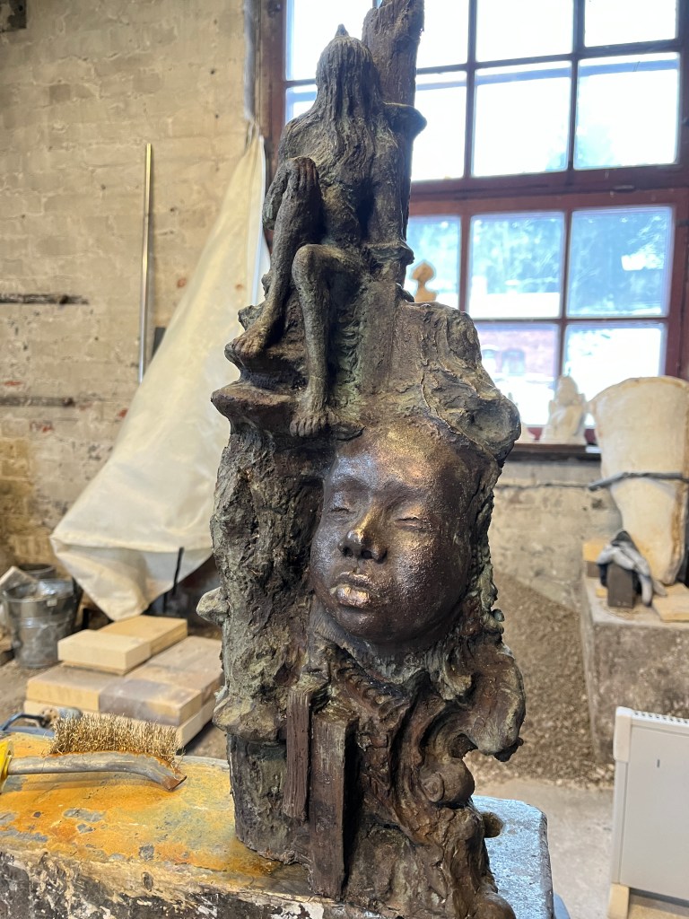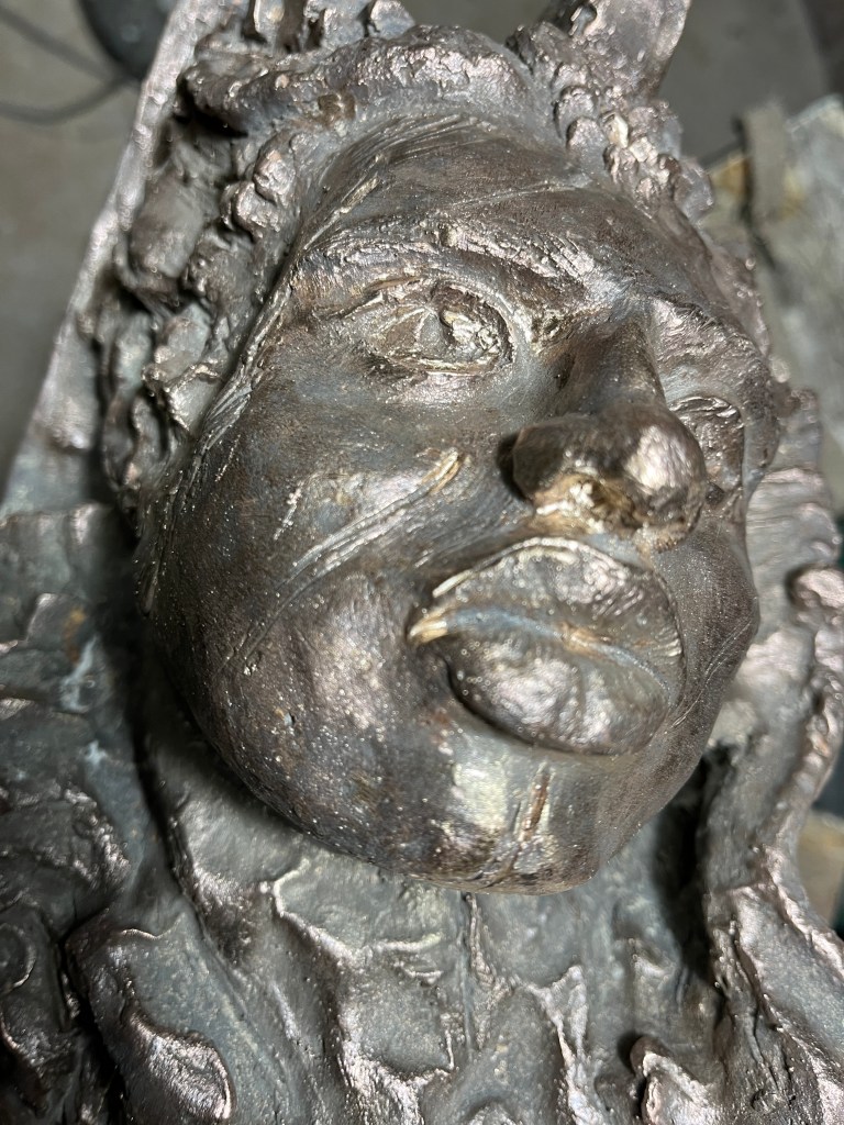Here i use natrium sulfid to make the bronze darker. I first polished all the finished statue and then add it, heating the bronze to make the darker effect. I do this in many layers, little by little. After making the patina almost black, i start to polish the sculpture to bring the highlights more visible.