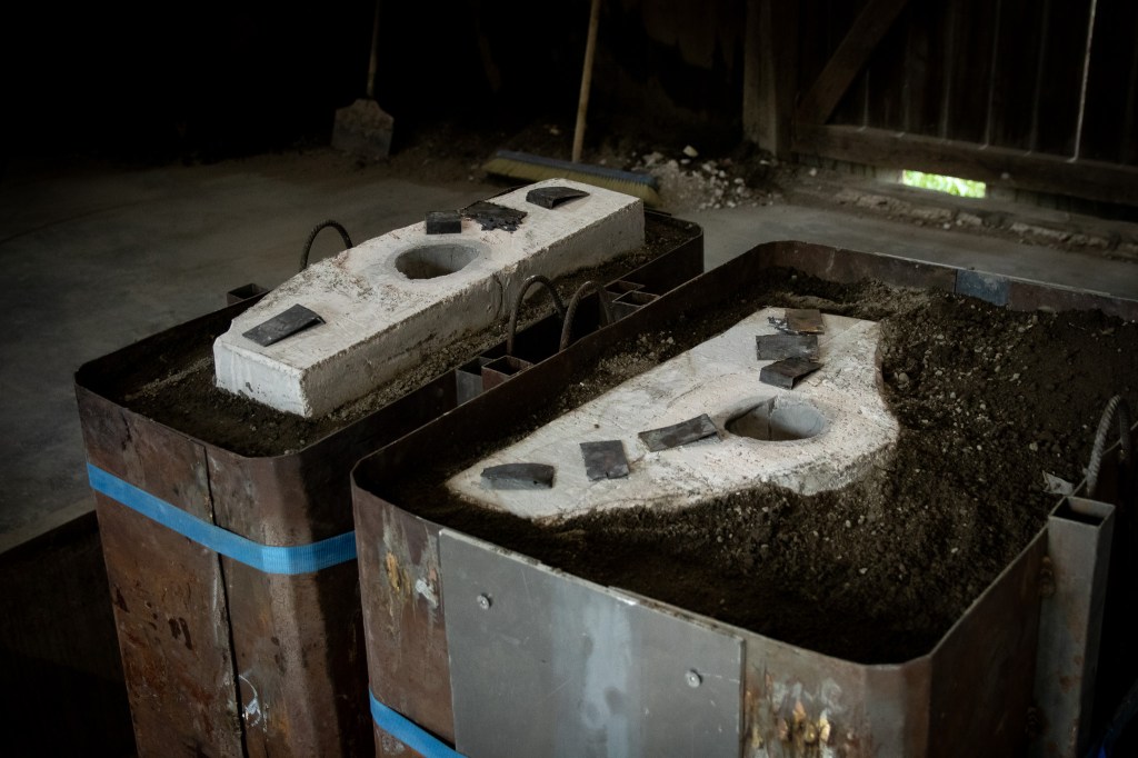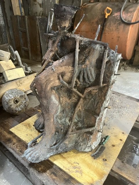 Here are two photos after opening the molds and cleaning the raw bronze. The casting channels are still on place and will be removed at first.